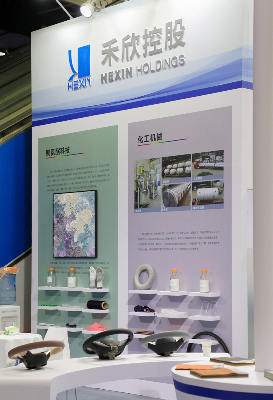禾欣展臺B-T3位于會展中心中軸線,占據了展會C位。展臺以開放式布局體現開放、包容的展陳理念;藍、白主調輔以淺綠、淺灰、淺咖等淺色系,傳達出簡約、舒適的視覺效果。展板清晰展示了聚氨酯科技、化工機械、基布染整、絨面超纖、合成革、超纖皮等主營業務,令參觀者一目了然。三幅皮革畫作既傳達了綠色環保理念,也為展會增添藝術氣息。展品除了豐富的皮革掛樣外,成品展示區還陳列了汽車內飾、沙發、箱包、鞋靴、運動、電子包裝等的應用場景。